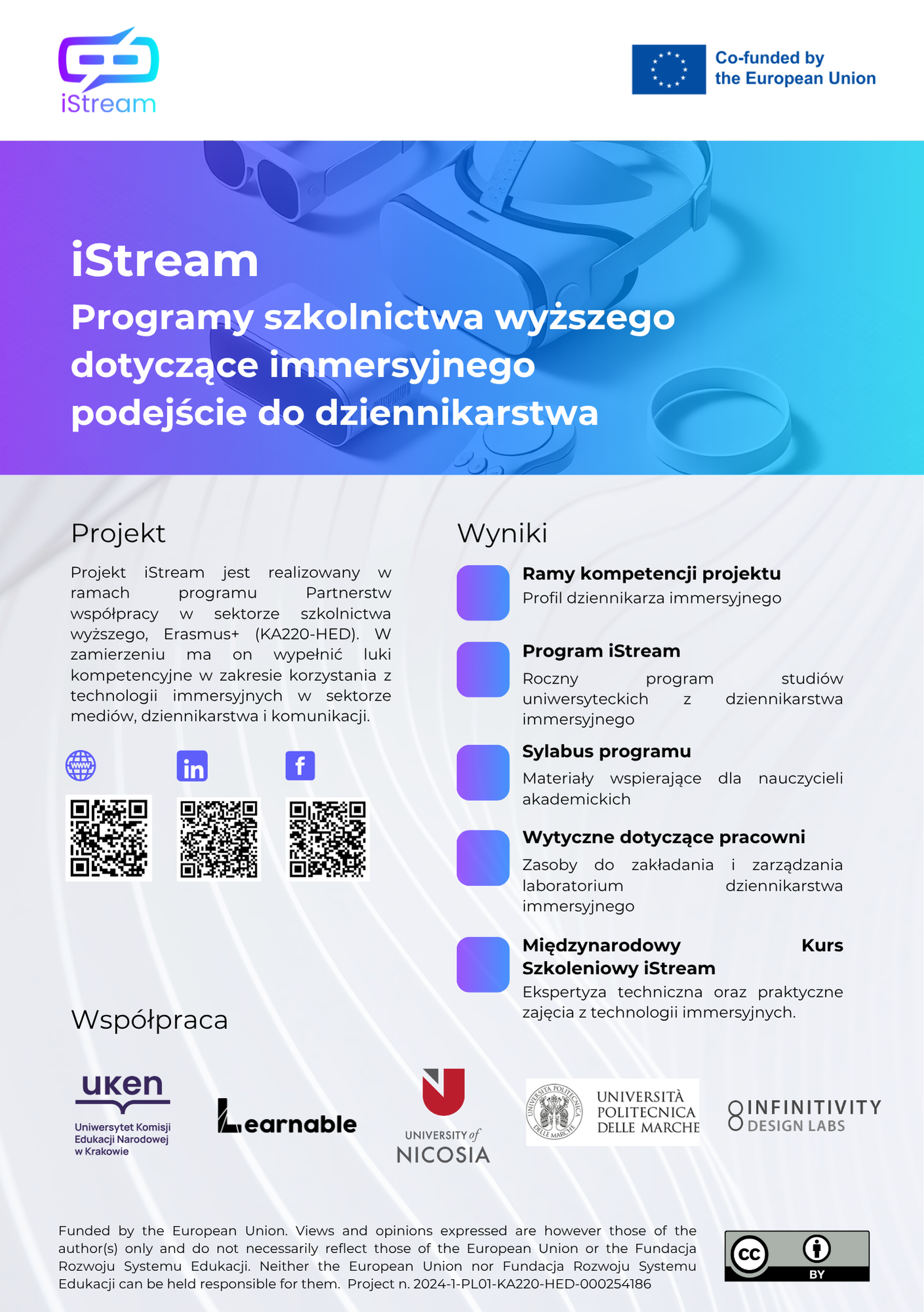 Projekt iStream jest realizowany w ramach programu Partnerstw współpracy w sektorze szkolnictwa wyższego, Erasmus+ (KA220-HED). W zamierzeniu ma on wypełnić luki kompetencyjne w zakresie korzystania z technologii immersyjnych w sektorze mediów, dziennikarstwa i komunikacji. Jego celem jest poprawa skuteczności programów nauczania w szkolnictwie wyższym, a tym samym zmniejszenie niedopasowania umiejętności cyfrowych w europejskim sektorze mediów i komunikacji. iStream odpowiada ponadto na rosnącą potrzebę konieczności ustrukturyzowanych zasobów akademickich i kompetencji związanych z technologiami immersyjnymi w dziennikarstwie i edukacji medialnej.